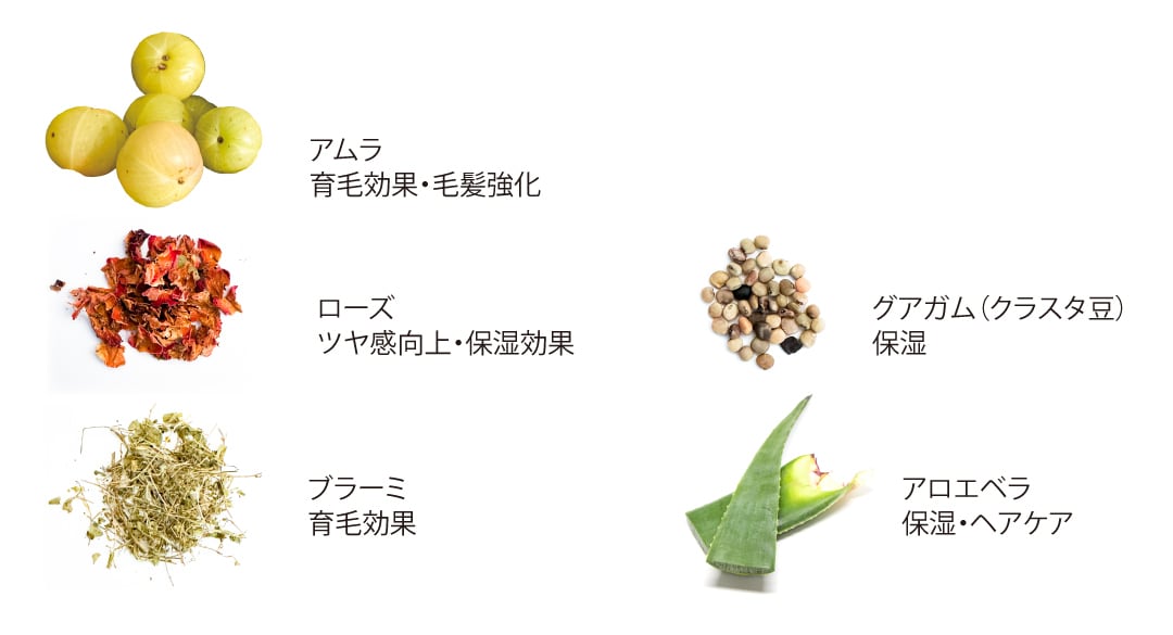 高品質の天然ヘナであるナチュラルとインディゴに、グアガム・アロエを添加し粘性と保湿力を高めています。育毛効果・艶出しにローズ・アムラ・ブラーミを配合しています。